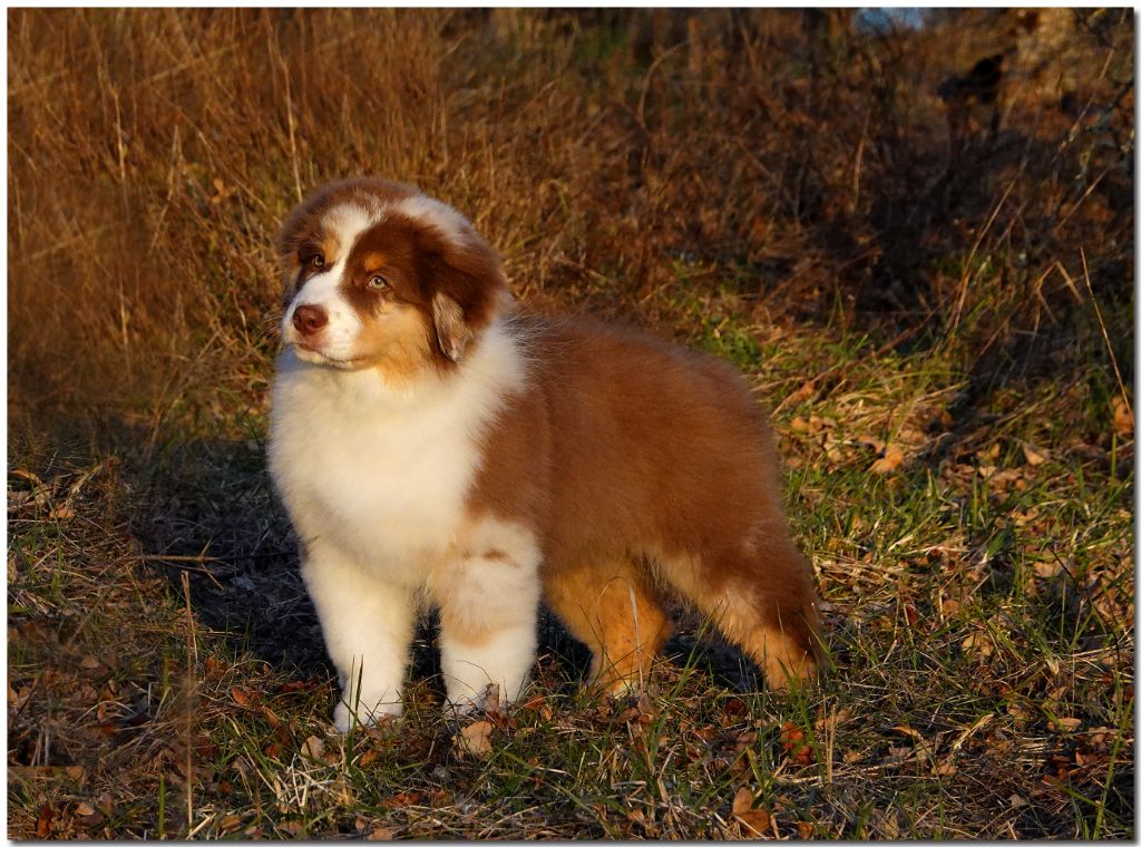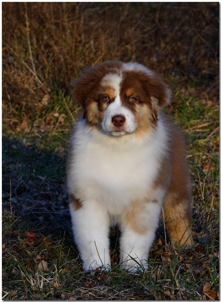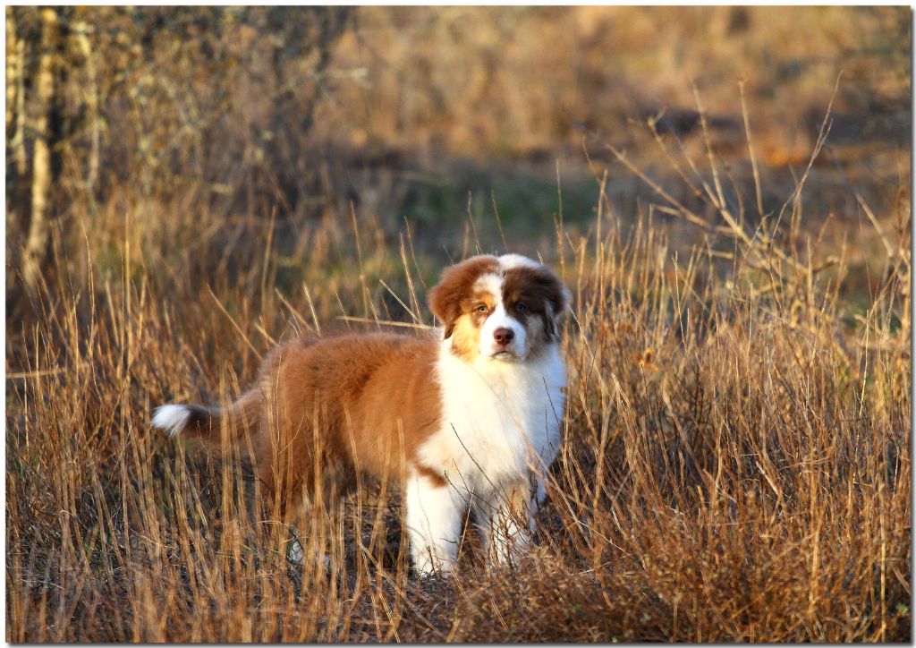 Très beau mâle Rouge Merle presque minimal Queue Longue, photos à 12 semaines